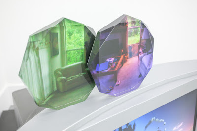 Two jewels gleam on the wall, yellow-green and blue-red eyes surveying the space. Together they are After Evening Thunderstorms, June 2002 and June 2007 (2013), a pair photographs from Cochrane’s personal collection, each mounted behind an acrylic prism—a paperweight? an award? a crystal ball? These two snapshots were taken in the same room, five years apart, each an attempt to capture and reproduce “that quality of light—a very particular kind of hyper-saturated yellow-green.”^ Windows in particular have a specific job: letting the light in, framing the view. Windows are contemplative by their very nature, conjuring ideas about reflection, longing, escape… Cochrane’s pictures of windows here, now viewed from a distance in time through a bevelled crystalline filter, put us in that room looking out those windows. Viewing the rest of the exhibition from this position, we might feel that we’re looking through Cochrane’s own lens. Is this the key?